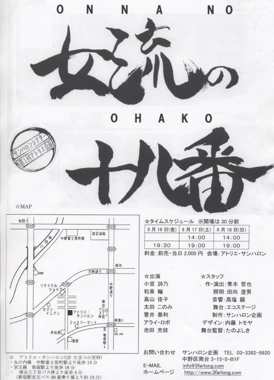 キャスト A 城所早苗(フランチャイズのたこ焼き『たこQ』社長)……太田このみ B 大蔵扶美(占い師養成スクール及び『占いの蔵』をチェーン展開)……高山佳子 C 坪内紀子(介護用品販売会社『かなえ』の女社長の娘)……和泉輪 D 伊集院次郎(城所の秘書)……アライ・ロボ E 浦野浩二(扶美の付き人)……菅井泰利 F 平井直子(キャディ)……小宮詩乃 G 林貞子(キャディ)……池田充枝 スタッフ 照明:田向澄男 音響:高塩顕 舞台:エコステージ 制作:サンハロンシアター デザイン:内藤トモヤ 舞台監督:たのよしき 9月16日(金)〜18日(日)会場:アトリエ・サンハロン